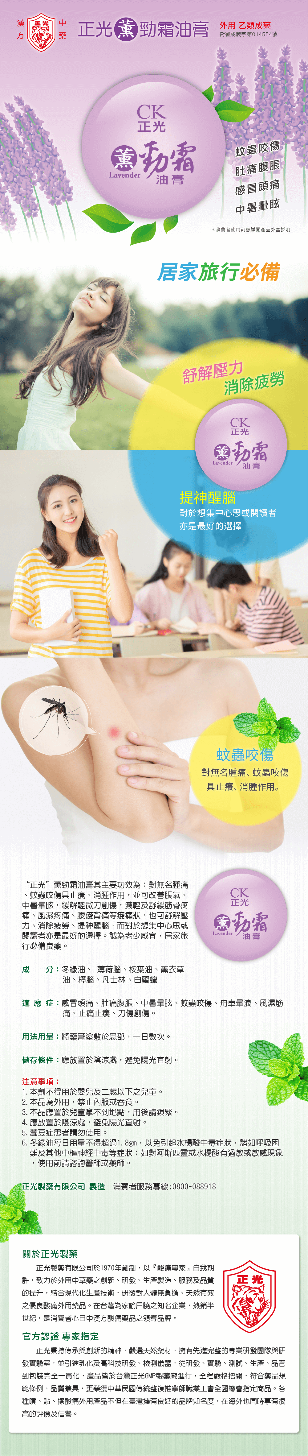 | 產品成分 | 冬綠油、薄荷腦、桉葉油、薰衣草油、樟腦、凡士林、白蜜蠟。 |