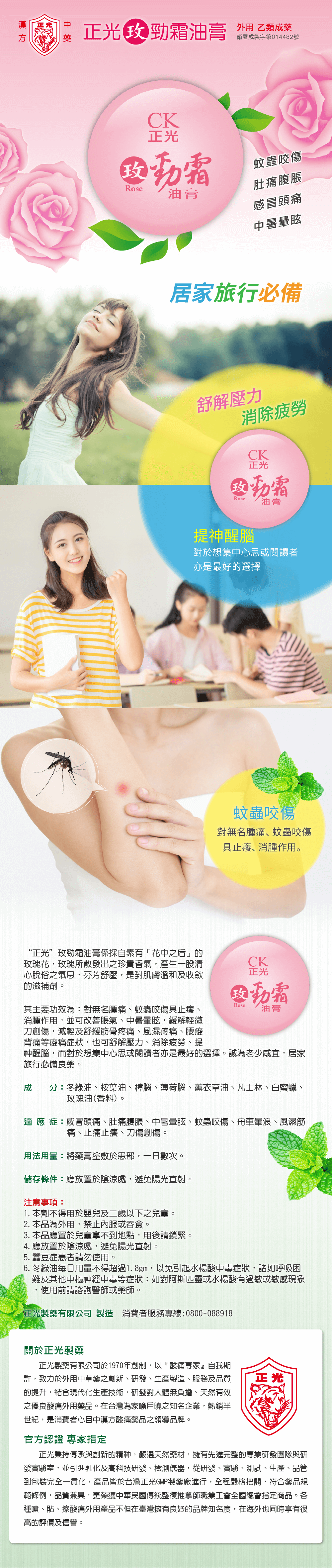 | 產品說明 | “正光”玫勁霜油膏係採自素有「花中之后」的玫瑰花,玫瑰所散發出之珍貴香氣,產生一股清心脫俗之氣息,芬芳紓壓,是對肌膚溫和及收斂的滋補劑。 其主要功效為:對無名腫痛、蚊蟲咬傷具止癢、消腫作用,並可改善脹氣、中暑暈眩,緩解輕微刀創傷,減輕及舒緩筋骨疼痛、風濕疼痛、腰痠背痛等痠痛症狀,也可舒解壓力、消除疲勞、提神醒腦,而對於想集中心思或閱讀者亦是最好的選擇。誠為老少咸宜,居家旅行必備良藥。 採高科技方法萃取以下數種藥材精製而成: 玫瑰油:愉悅心情。 冬綠油:主治頭痛、脹氣、風濕、筋痛。 桉葉油:舒緩疼痛、止癢。 樟腦:止痛、驅蟲。 薄荷腦:清涼提神。 薰衣草油:驅蚊除蟲,情緒紓放。 |
