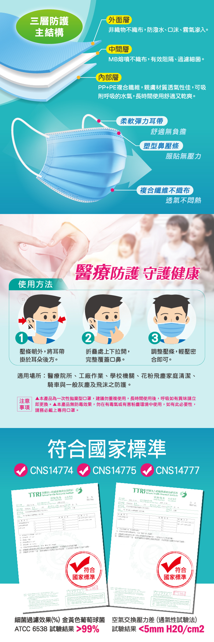 適用場所 防塵濾菌(金黃色葡萄球菌),醫療院所、學校機關、工廠作業、騎車與一般灰塵、家庭清潔等場合均適用