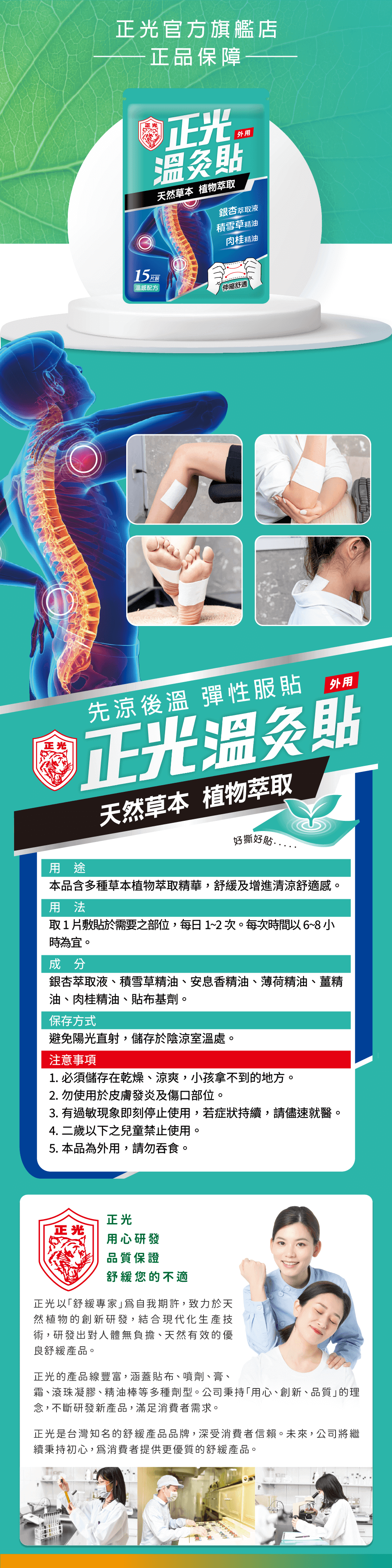 | 產品說明 | 天然草本植物萃取 伸縮舒適好撕好貼 草本成份,先清涼後溫熱,舒緩不適感 溫感配方 |
